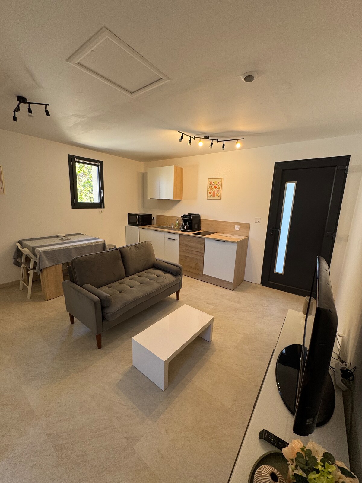 Добро пожаловать в эту очаровательную квартиру, идеально расположенную недалеко от деревни. Это хорошо оборудованное жилье рассчитано на 2 человек и идеально подходит для пар или деловой поездки. Отдельная спальня с двуспальной кроватью Диван, телевизор и обеденная зона. Оборудованная кухня: плита, холодильник, микроволновая печь, посуда и кофеварка. Кондиционер для охлаждения / отопления Ванная (душ) Wi-Fi. К сожалению, домашние животные не допускаются.