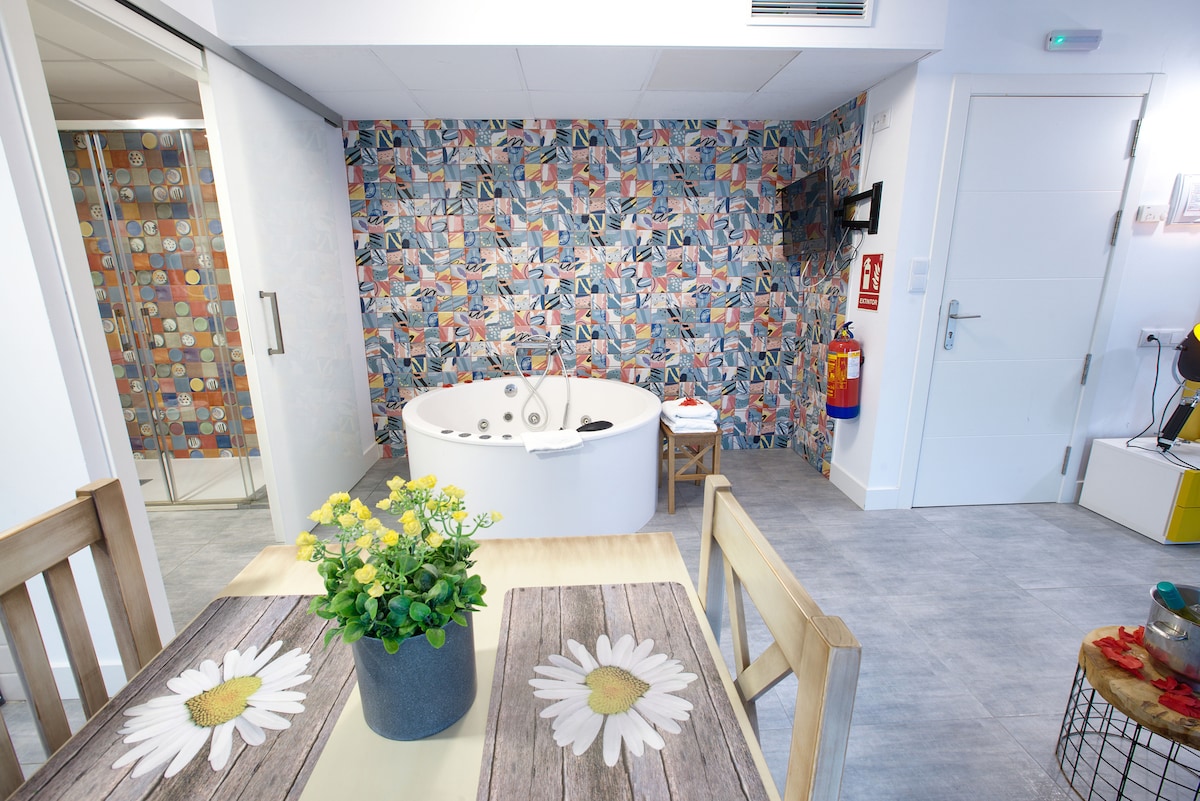 Это жильё состоит из джакузи (на двоих), панорамного камина, кровати 150 см, полностью оборудованной кухни со всей домашней утварью, а также духового шкафа, микроволновки,тостера, сэндвич-машины, 40-дюймового телевизора с DVD (где вы можете его увидеть)и полностью оборудованной ванной комнаты со всем необходимым для личной гигиены. БЕСПЛАТНЫЙ WIFI Домашнее постельное белье, полотенца и простыни, одеяла, одеяло и т.д. Также все дрова и другие аксессуары, необходимые для камина, совершенно бесплатно.