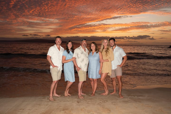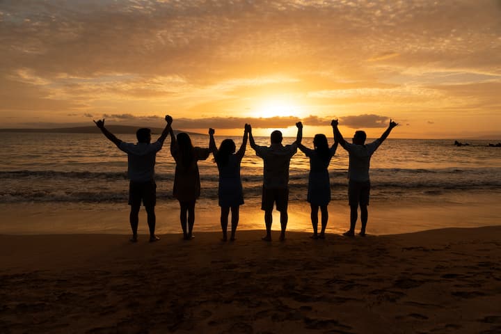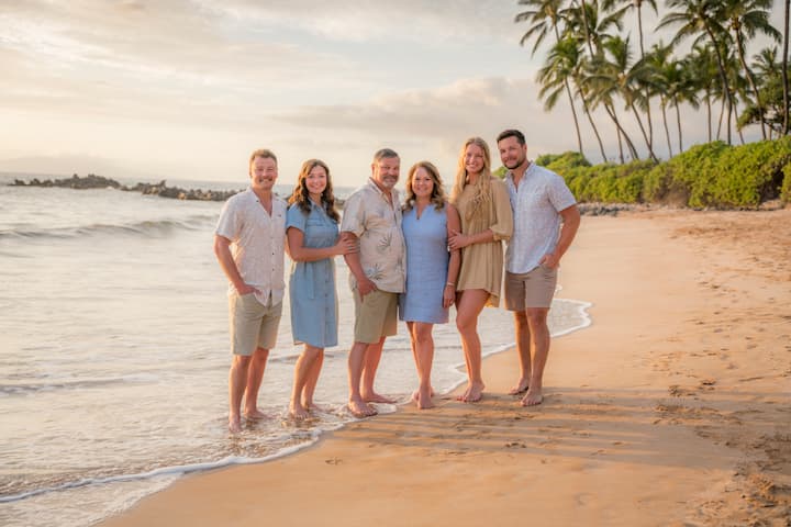 Фотосессия на пляже Мауи на закате (1,5 часа). 75 отредактированных снимков в высоком разрешении, онлайн-галерея, сдача работы за 7 дней. Идеально для больших семей, особенно групп от 8 человек.