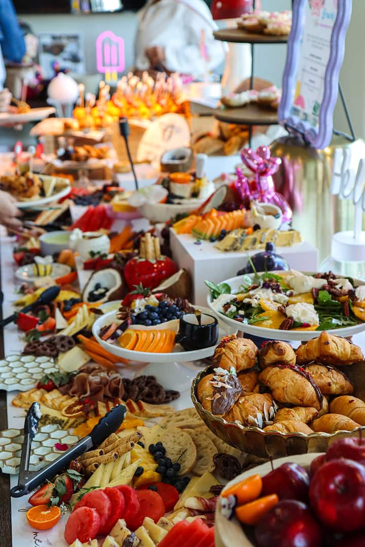 Индивидуальный стол с закусками: сыр и мясное ассорти, свежие фрукты, мед, крекеры, выпечка, джемы, орехи.