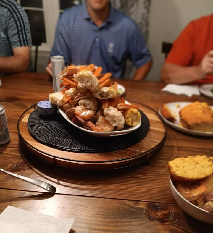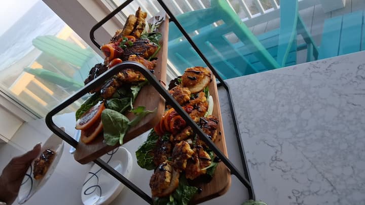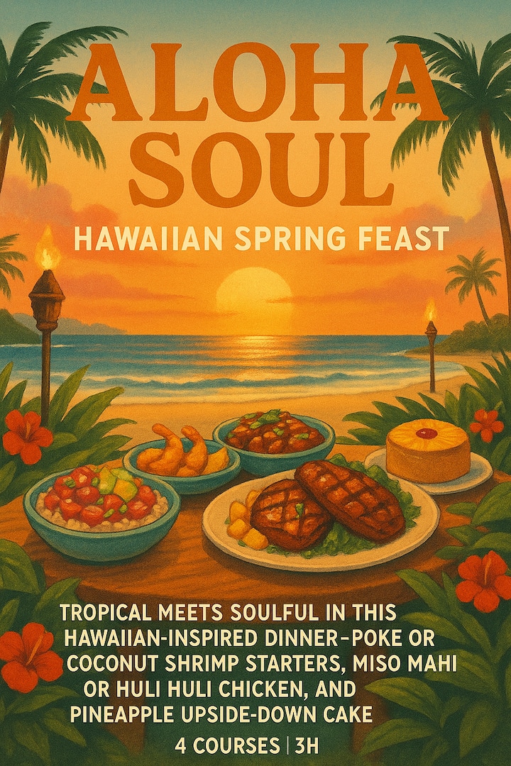 Меню из 4 блюд включает поке с тунцом или арбузом, кокосовые креветки, махи-махи с мисо и медом или курицу хули-хули, а также перевернутый ананасовый пирог. Теплый островной отдых.