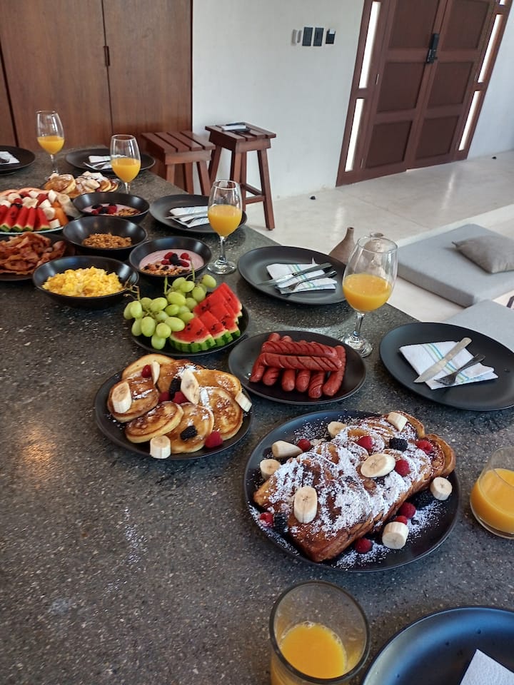 Соки, кофе, яичница-болтунья, соусы, хлеб, вафли, севиче из креветок, буррито с курицей. МИМОЗЫ