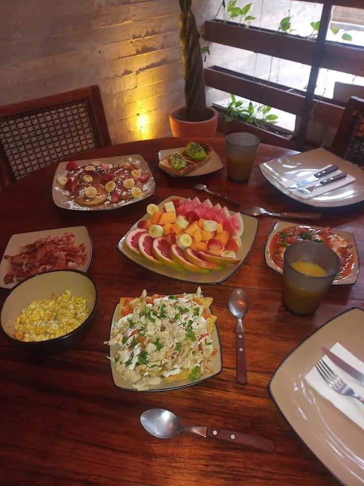 Включает красные чилакилес с курицей, яйца ранчеро, свежие фрукты, блины, яичницу, сок и кофе