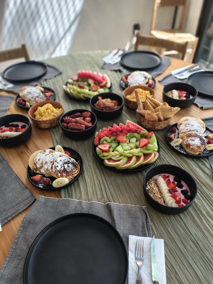 Свежие фрукты, оладьи, тосты с авокадо, яичница, йогурт, гранола, кофе и сок