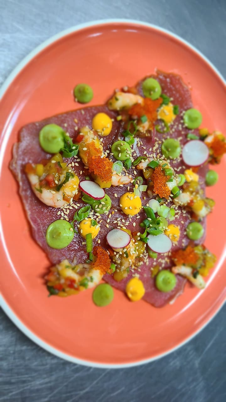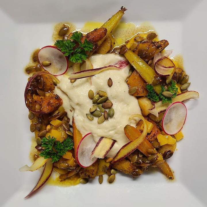 Меню дегустации «с фермы на стол», в котором текстуры, температуры и вкусы сочетаются в сбалансированной и элегантной прогрессии. 6 блюд, включая 1 канапе, 2 закуски (холодные и горячие), 2 основных блюда и 1 десерт.