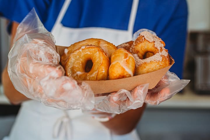 100% веганские горячие и свежие пончики. Эти пончики очень вкусные. Они просто тают во рту. Подаются в упаковках по пять штук. То же, что и в нашем типичном меню, с тремя топпингами: глазурь, сахар с корицей и сахарная пудра.