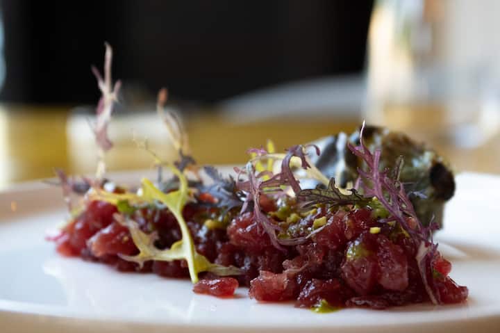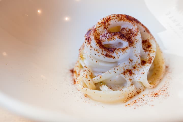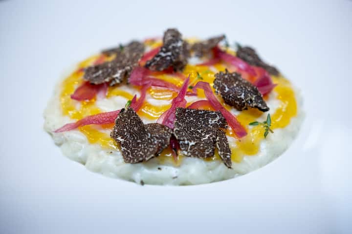 Дегустационное меню из 8 блюд с подходящими напитками. Гости участвуют в приготовлении.