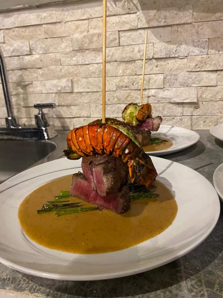 Меню на выбор: стейк из говядины, карибский лобстер или улов дня, спаржа, овощи на гриле, булочки, соусы и заправки, а также торт со свечами.