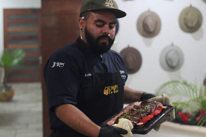 Мексиканская аррачера на углях: мягкий и маринованный кусок с аутентичным вкусом, сопровождаемый асадо чоризо. Включает свежий салат из шпината, листья салата, жареное яблоко, миндаль и заправку из бальзамического уксуса. Кроме того, паста с маслом и жареными овощами, гуакамоле, пико-де-гайо и топос. Мексиканский праздник, полный ароматов и традиций.