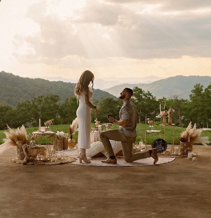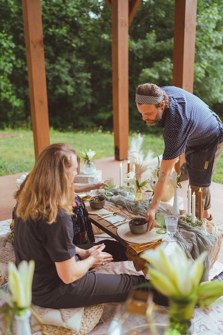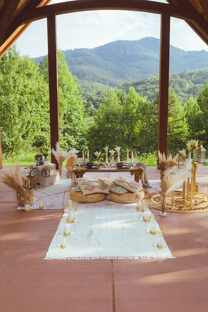 Роскошный пикник с коврами, подушками, свечами, цветами и декором