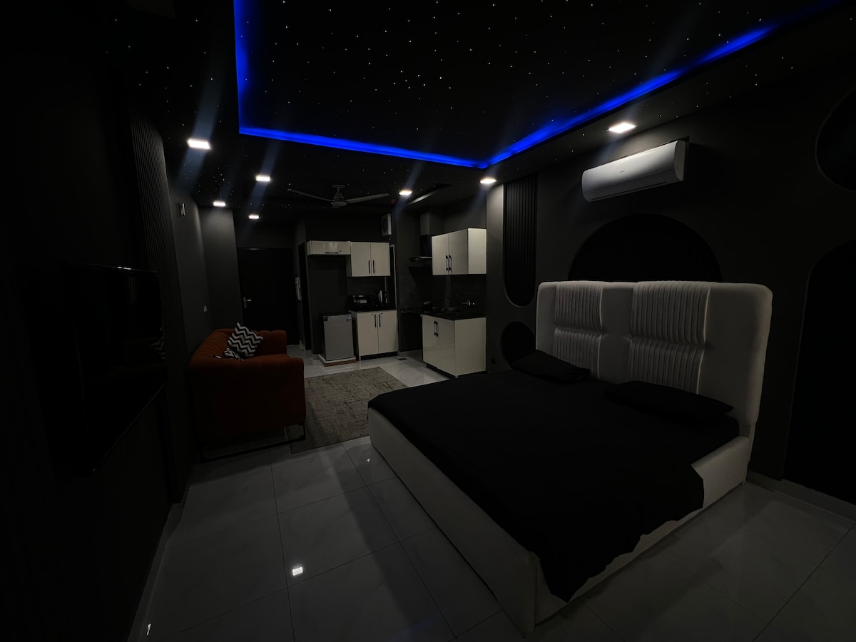 Cozy designer studio with warm lighting, Netflix, and luxe vibes. Enjoy a comfy queen bed, aesthetic decor, backlit mirror, snack basket, and a sleek kitchenette. Perfect for business trips or solo travelers. Located close to top cafes and shops. Ideal for unwinding or content creation. Where you’re located: 1. 5 mins from Motorway 🛣️ 2. 10 mins from Ring Road 🚦 3. 15 mins from Emporium Mall 🏬 4. 15 mins from Restaurants 🍲 5. 20 mins from DHA. 🏘️ 6. 25 mins from Gulberg. 🏪