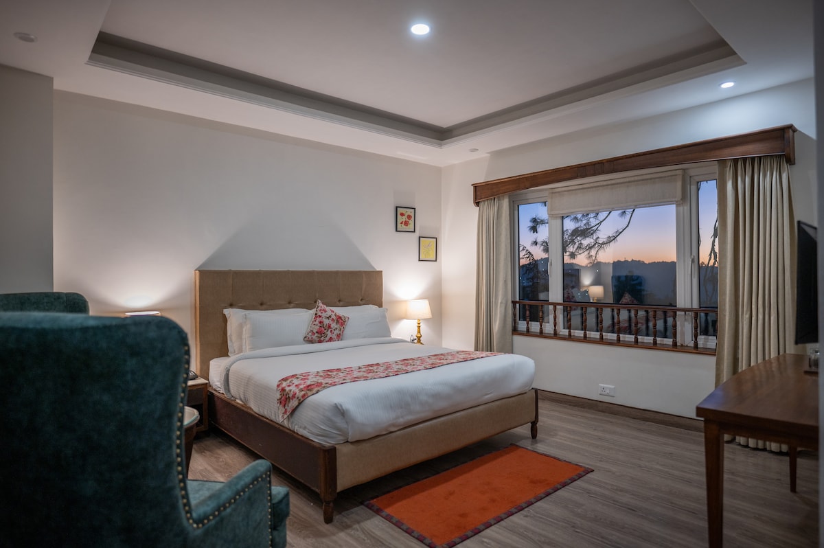 ◆Всего в 4,7 км от аэропорта Шимлы ◆Люкс с потрясающим видом на горы В номере◆ есть роскошная круглая кровать и собственная ванная ◆Теплый свет и стильные светильники усиливают атмосферу ◆Элегантный деревянный интерьер создает уютную и стильную атмосферу ◆Большие окна с мягкими белыми шторами приглашают любоваться природой ◆Идеальное место, чтобы насладиться безмятежным шармом Шимлы