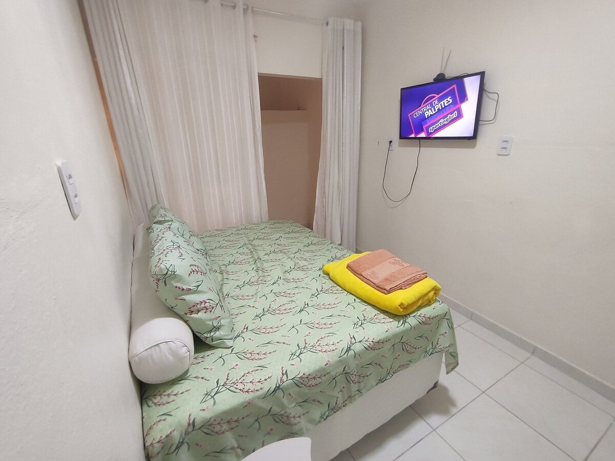 Acomodação Raiz com 1 cama casal no quarto e na sala um sofá Bicama acomodando bem até 4 pessoas. - 500 metros do shopping Caruaru 🛍️ - 400 metros do Point do caldinho 😏 - 300 metros da padaria 🥯 - 5 mim de carro para o pátio de Eventos de Caruaru - 8 mim de carro para a Feira de artesanato de Caruaru 👒