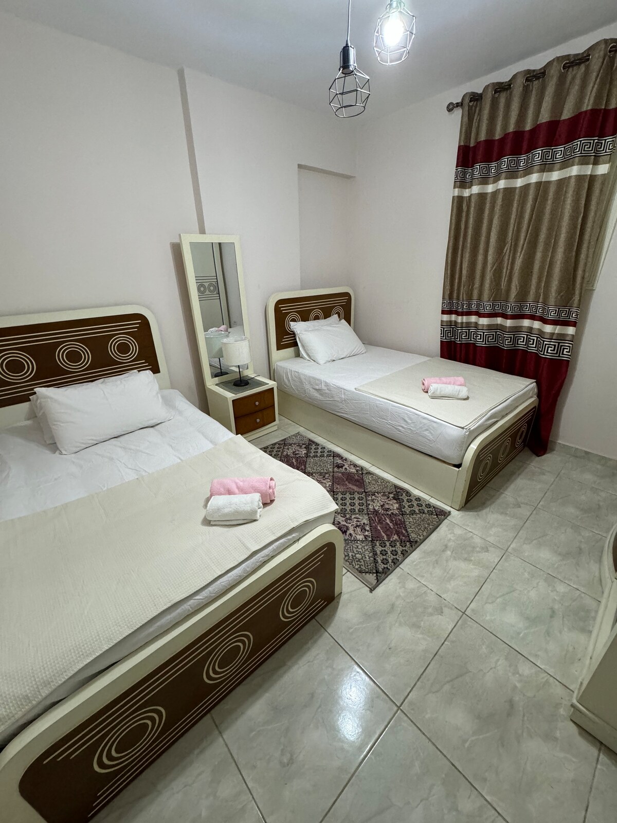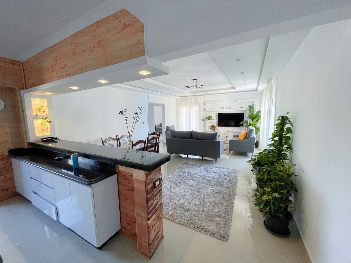 All what you need in this breath-taking apartment. •Best Location. •2 bedrooms “2 Queen Beds”. -1 sofa bed. •1.5 Bathrooms. •1 Shezlong Sofa. •Fully Equipped Kitchen. •Washing Machine. •Dinning Room. •Iron Available. •3 TVs ( iptv) •Free Wifi. •3 Available Air Conditioners (Cold/Warm). •Free Electricity, Water & Gas Bills for short stays only. Long-term reservation will have to pay Electricity, Water & Gas bills. • Security Guards.
