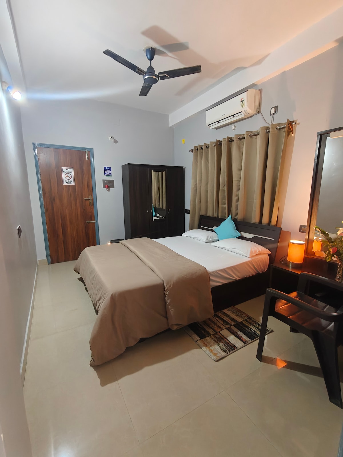 Find your peace at Solace Homestay, a thoughtfully designed stay in the heart of Siliguri. Perfect for hill transit or business trips, it offers a sun-lit bedroom, private city-view balcony, and a chic low-seating lounge. The building has a * lift*, ensuring easy, stair-free access. Less than 1 km from Acropolis Mall, close to Cosmos & Vega Circle, 8 mins to Junction, 15 mins to NJP, 28 mins to the airport, and a 5-minute walk to the local market.