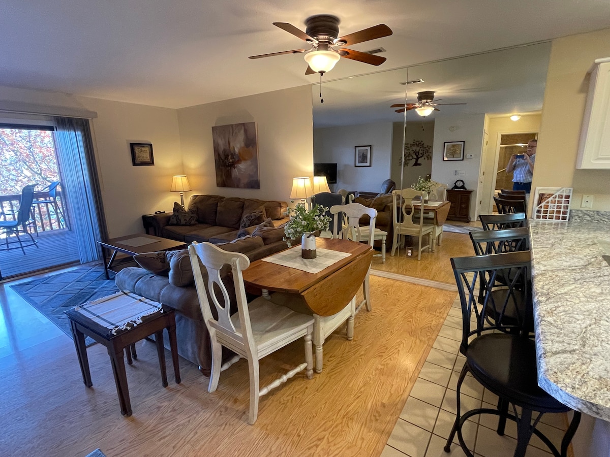 Наслаждайтесь жизнью Брэнсона и озера в этом кондоминиуме в центре Индиан-Пойнт. 2 кровати/2 ванные комнаты с диваном для сна на 6 спальных мест, полностью оборудованная кухня с кофе. Нужно больше места? - У нас есть еще одна квартира, если вы хотите забронировать и то, и другое. Прямой доступ к озеру. Всего 1 м до Силвер-Доллар-Сити с Landing, поля для гольфа и шоу всего за 1 м. Бассейн, гидромассажная ванна, теннис/маринованный мяч/бабольная площадка, игровая площадка и тропа к озеру. Большая терраса с экраном. Бесплатный WI-FI, кабельное телевидение и смарт-телевизоры. Полностью оборудованная прачечная. 12 ступеней.
