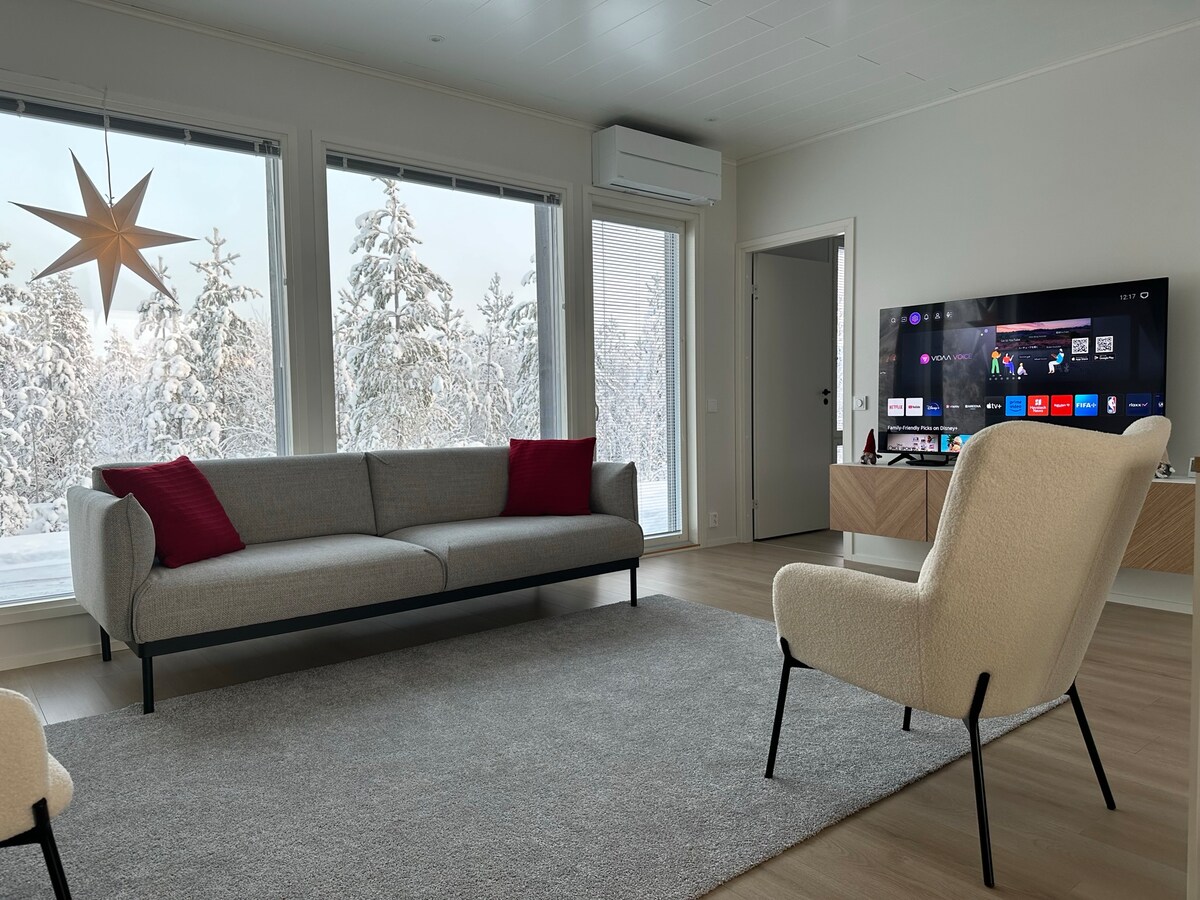 Наш дом - это новый частный дом на берегу реки Кемийоки, в 12 км от Рованиеми в направлении Кеми. Дом находится в живописном, тихом районе. В нашем доме есть все современные помещения и оборудование, автоматическое отопление и кондиционирование. Сауна, ванная комната и туалет, бесплатный Wi-Fi, стиральная/сушильная машина, посудомоечная машина, индукционная плита/духовка, камин и т.д. Открытая терраса в направлении реки Кемийоки. Наш дом великолепен особенно для семей с детьми. Просторный и тихий двор дает детям возможность играть на улице.