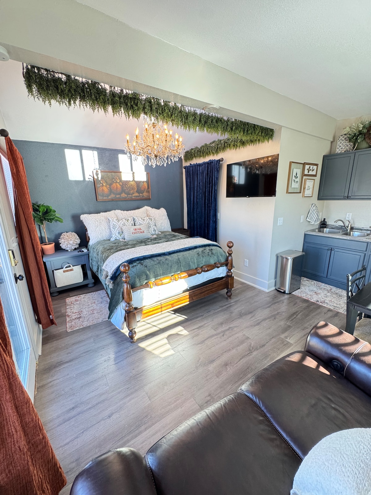Насладитесь спокойным и спокойным пребыванием в нашем милом маленьком домике Alley House вместимостью до 3 человек. Это крошечные апартаменты с 1 спальней с кроватью размера Queen size, диваном-кроватью, которая при необходимости превращается в двуспальную кровать и 2 настенных телевизора. Мини-кухня оснащена кофейной станцией, холодильником/морозильной камерой, переносной плитой и микроволновой печью. Шкафы укомплектованы всеми вашими кулинарными потребностями. Квартира оснащена 2 сплитными кондиционерами/отопительными приборами для дополнительного комфорта.