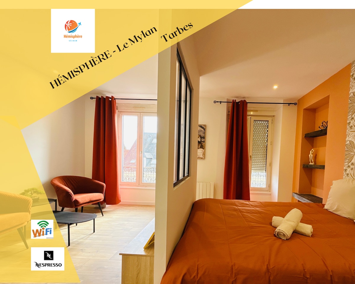Joli petit studio en hyper centre de Tarbes de 20m². Se situe au fond d'une résidence sécurisée et calme. EMPLACEMENT AU TOP!!!!!!! Vous disposez du parking gratuit place Marcadieu à 300m de l'appartement. Places gratuites sur la rue parallèle. Mairie à 100m, Place Verdun et Jardin Massey à 300m. Navette gratuite à côté. L'appartement est équipé d'un lit en couchage 120x190 (2 personnes), TV LED, chauffage inertie fluide, cafetière Dolce Gusto... PETIT HAVRE DE PAIE EN DUO OU EN SOLO!!!