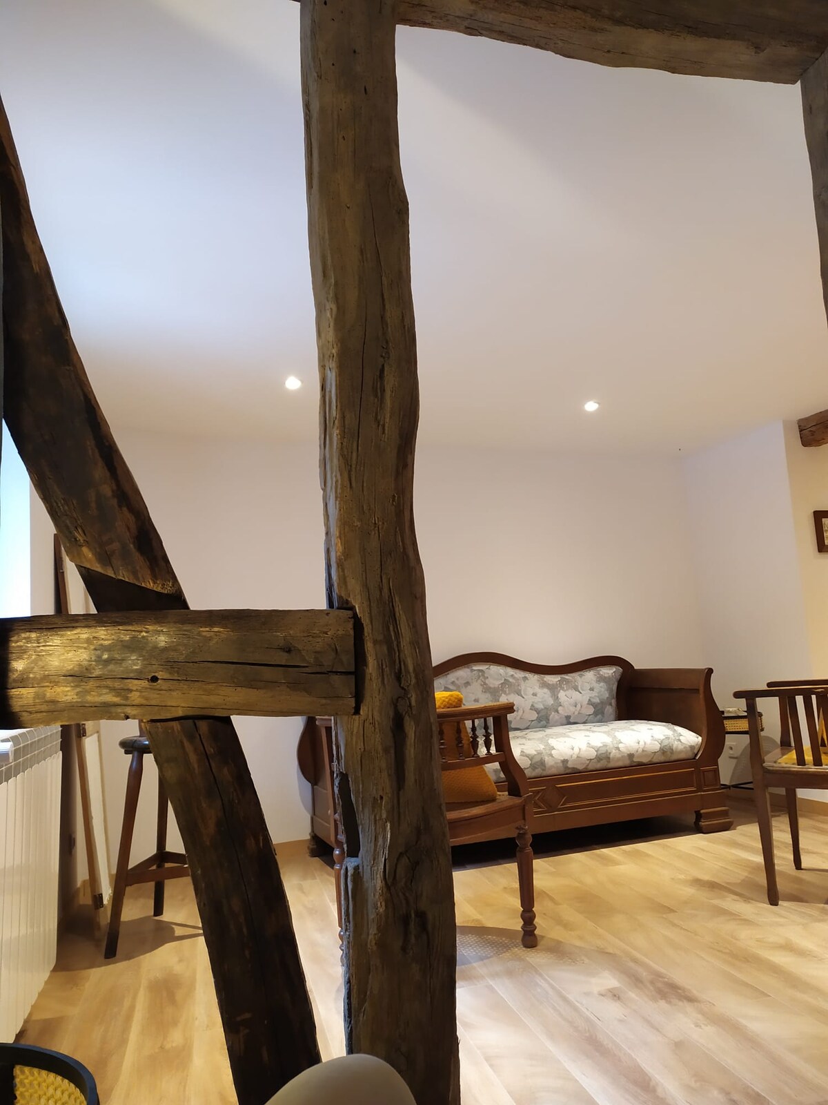Bienvenue dans notre maison alsacienne à colombages, entre vignoble et montagne. Nous mettons à votre disposition un chaleureux appartement indépendant de 50m² en demi rez de chaussée, classé meublé de tourisme 3***. Les 2 chambres donnent sur les vergers, et une place de parking vous est réservée dans la cour. La cuisine est toute équipée : plaque vitrocéramique, four, hotte, lave-vaisselle, frigo de bonne contenance.