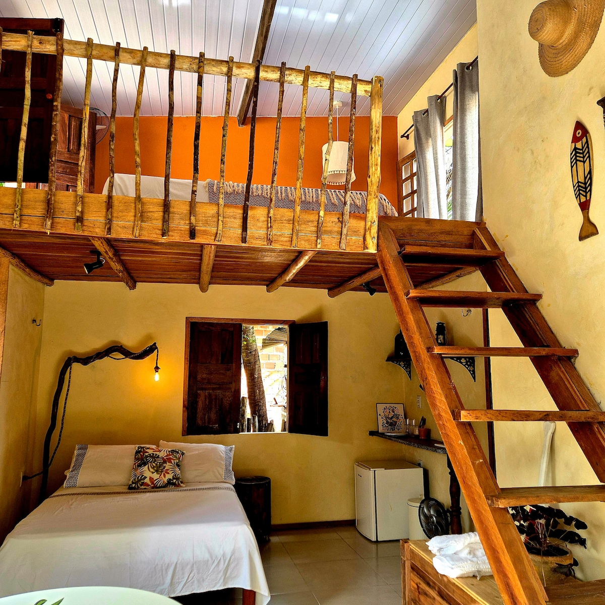 Насладитесь сущностью острова Марайо . Домик с мезонином, идеально подходящий для небольших семей и друзей. Здесь могут разместиться 4 человека на двух кроватях, одна двуспальная кровать размера King size в антресоли, другая пара - на первом этаже. Место для двух внутренних сетей и небольшой балкон в саду у входа.