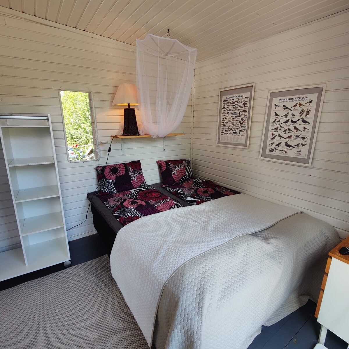 В амбаре Фредриканранты вы похожи на летний коттедж. Мы согреваем гостей по вечерам в отдельно согласованное время в пляжной сауне, или вы можете согреться сами, когда захотите. К услугам гостей гребная лодка, сапсерфинг и каяк. Предлагаю здоровый и обильный завтрак. Добро пожаловать в жилье для велосипедистов. Ваш питомец также может остановиться внизу. Жилье расположено в сельской местности примерно в 18 км от центра Лаппеенранты. Велосипеды/мотоциклы можно поставить в гараж с замками на ночь.