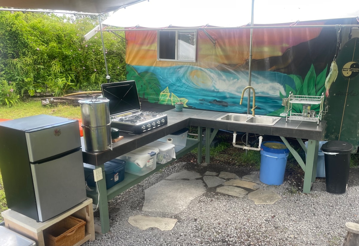 . Никакой УБОРКИ. Включен глэмпинговый домик со смывным туалетом. Просторная спальня 12 x 14 футов с двуспальной кроватью размера Queen size из пены с эффектом памяти. Обеденная зона на улице 20x20 включает небольшой холодильник с морозильной камерой, варочную панель с 5 конфорками, всю кухонную утварь и фильтр для воды Berkey. Горячий душ на открытом воздухе и гамак для дневного сна. Каяк, доски для серфинга и снаряжение для сноркелинга. * 7 минут до парка на берегу океана с приливными бассейнами. * 10 минут до универсального магазина Orchidlands, ресторана Kaleos и Pahoa. * 30 минут до Хило. * 45 минут до национального парка Вулкан.