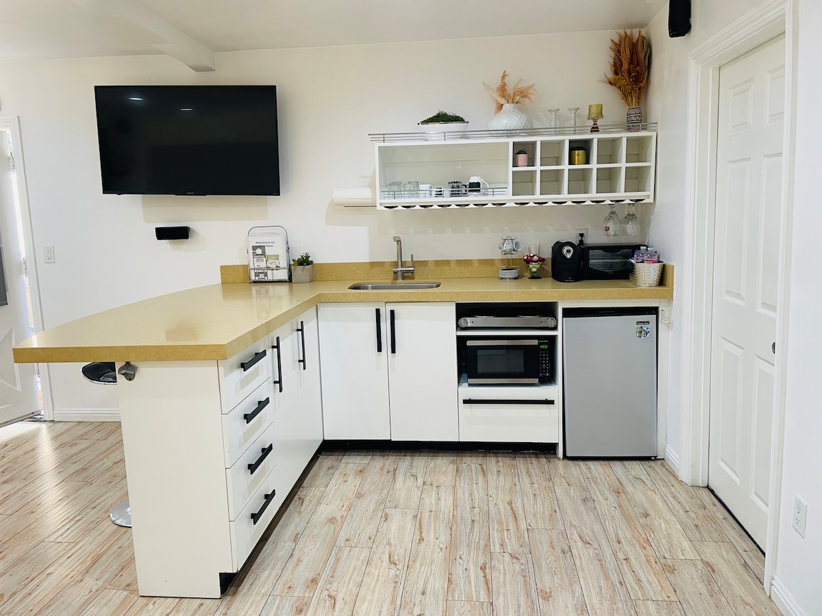 Modern Minimalist Studio — A Peaceful, Cozy Retreat This tiny yet inviting guesthouse studio is designed for comfort and efficiency. Inside, enjoy a thoughtfully equipped space with kitchen basics, central air/heat, and a smart TV. The true highlight is the "Zen-like" peacefulness of the backyard; step outside to find a quiet, serene atmosphere perfect for reflection. An ideal getaway for those seeking rest and a tranquil home base.
