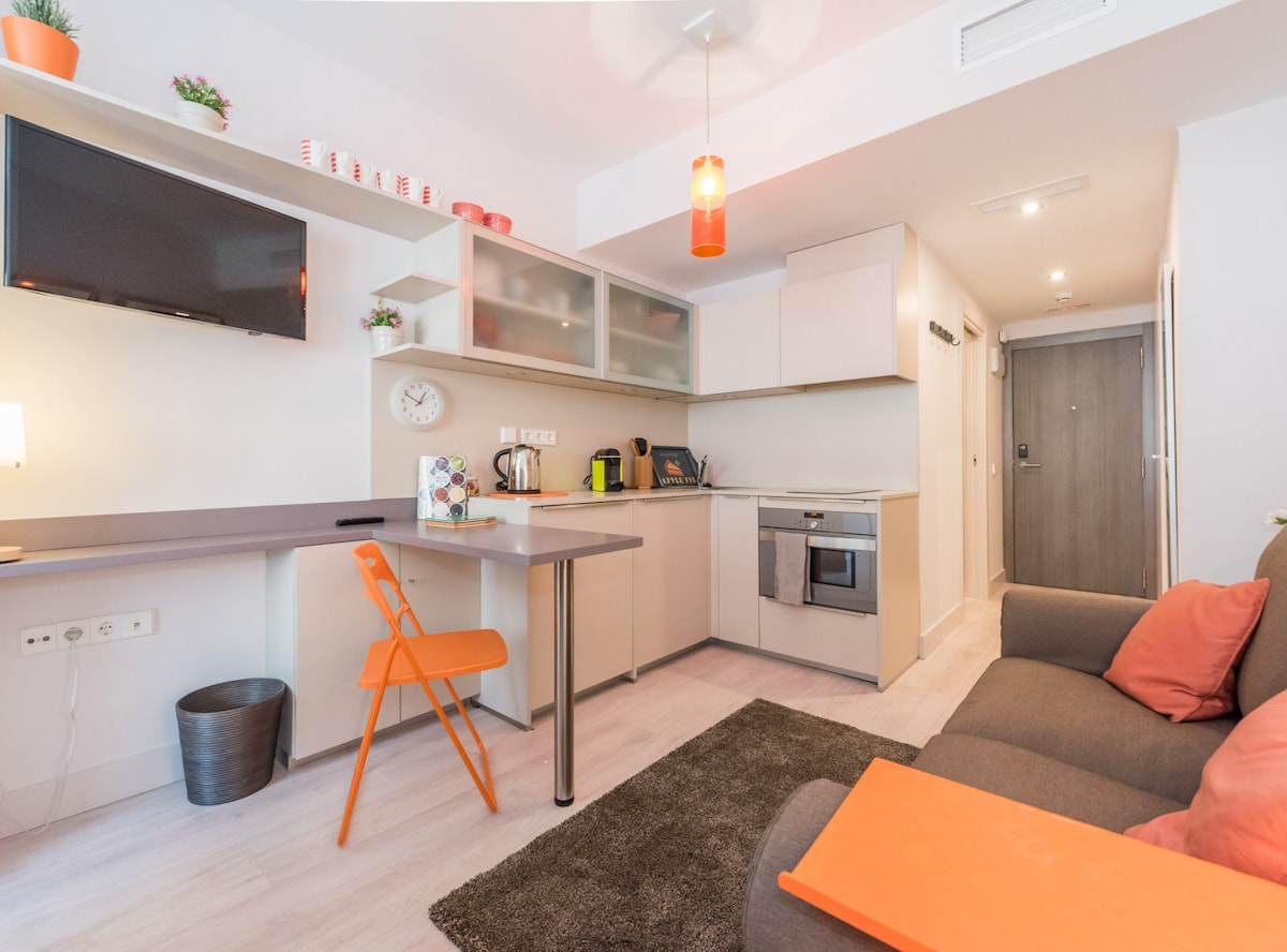 Квартира с одной спальней для 4 человек, ок. 45 м² Спальня с двуспальной кроватью и диваном-кроватью в гостиной. Полностью оборудованная ванная комната с большим количеством душевых поддонов, полностью оборудованная кухня с бытовой техникой (за исключением духовки и посудомоечной машины) и кухонной посудой. Телевизор LG Smart TV 43 дюйма в гостиной и телевизор LG Smart TV 32 дюйма в спальне Бесплатный высокоскоростной Wi-Fi. Парковка в самом здании, прямой доступ на лифте (15€/ночь) по запросу.