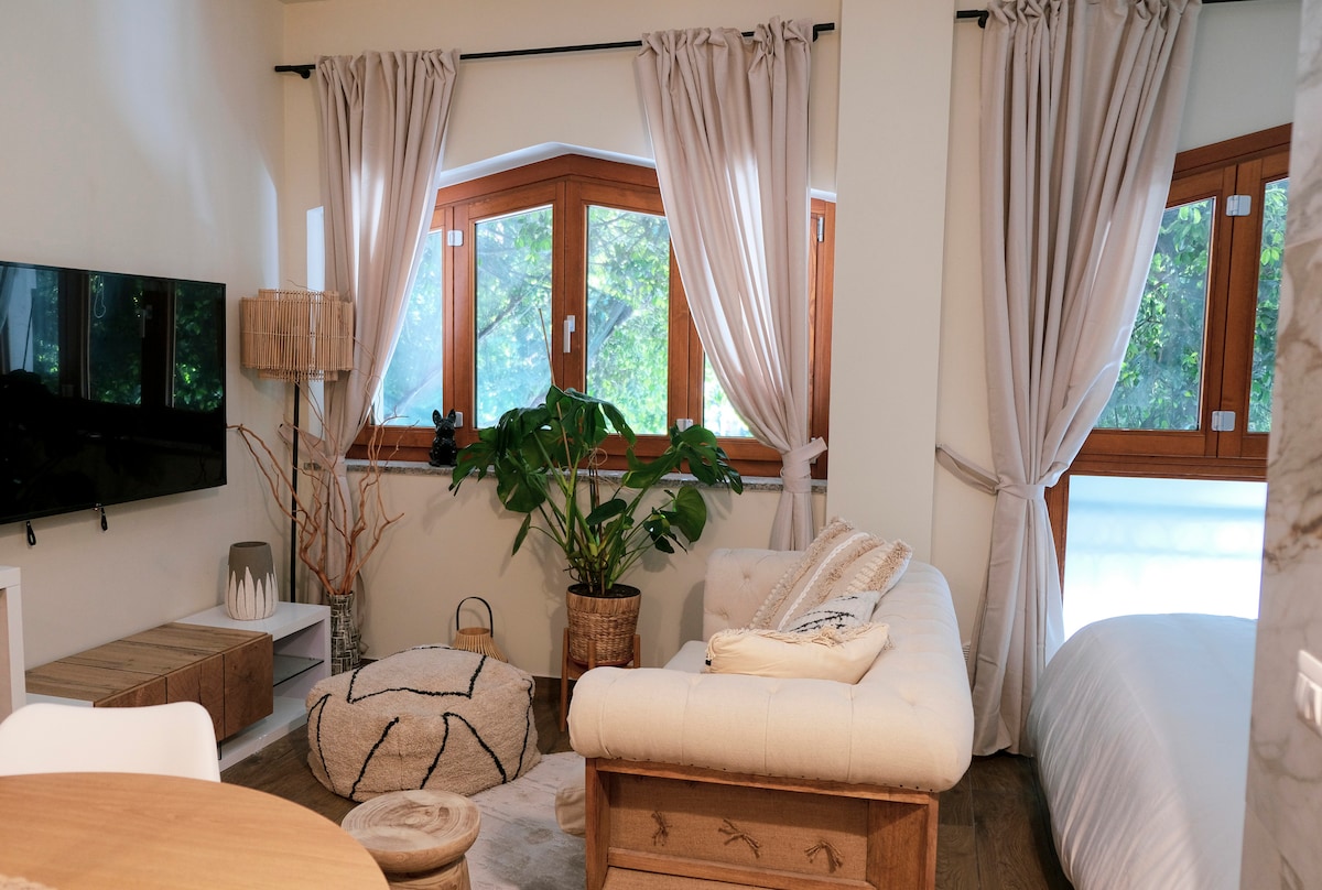 Квартира-студия на пляже 3. Квартира на первом этаже с частным садом, состоящим из: входа, спальни с двуспальной кроватью с двуспальной кроватью (включая односпальную раскладную кровать для 3 гостей) , 1 ванной комнаты с душем) , 1 ванной комнаты с душем, открытой веранды с террасой (отдельной) и видом на море, где вы также можете поесть и насладиться действительно сенсационным видом), мини-кухни на открытом воздухе (закрытой оконными дверями), душа на открытом воздухе и т. д.