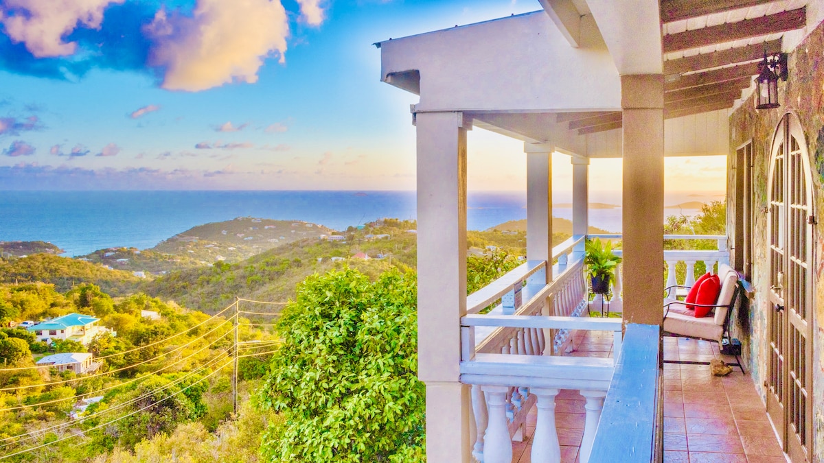 Beautiful hillside stone villa with sweeping ocean views, just 8 minutes from Cruz Bay. This 4-bedroom, 2-bath home features a king primary suite with private patio, two queen rooms, and a room with two full beds. Enjoy a fully equipped kitchen with coffee station, comfortable living area, A/C, Smart TVs, Wi-Fi, and three patios perfect for relaxing and taking in island breezes.