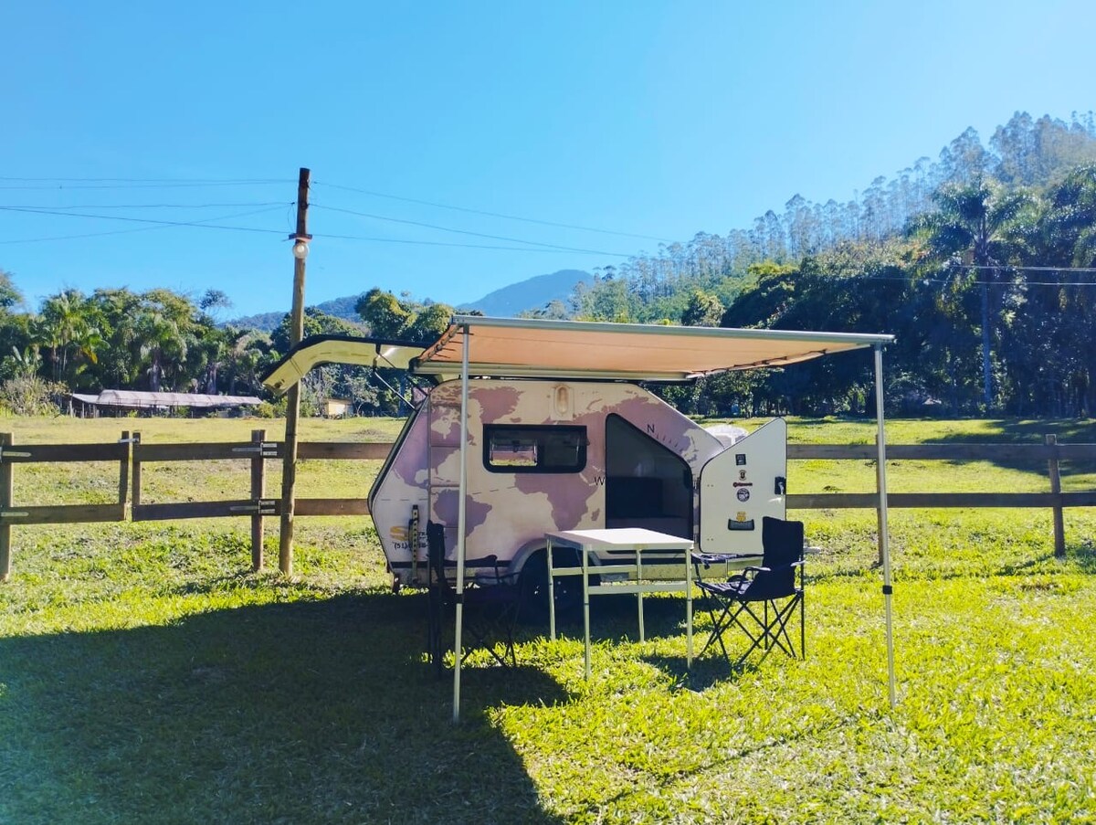 Uma experiência em um Mini Trailer, no meio da natureza, porém com fácil acesso e com boa estrutura de apoio, como água, energia elétrica, cozinha, banheiro com chuveiro elétrico, churrasqueira, etc...