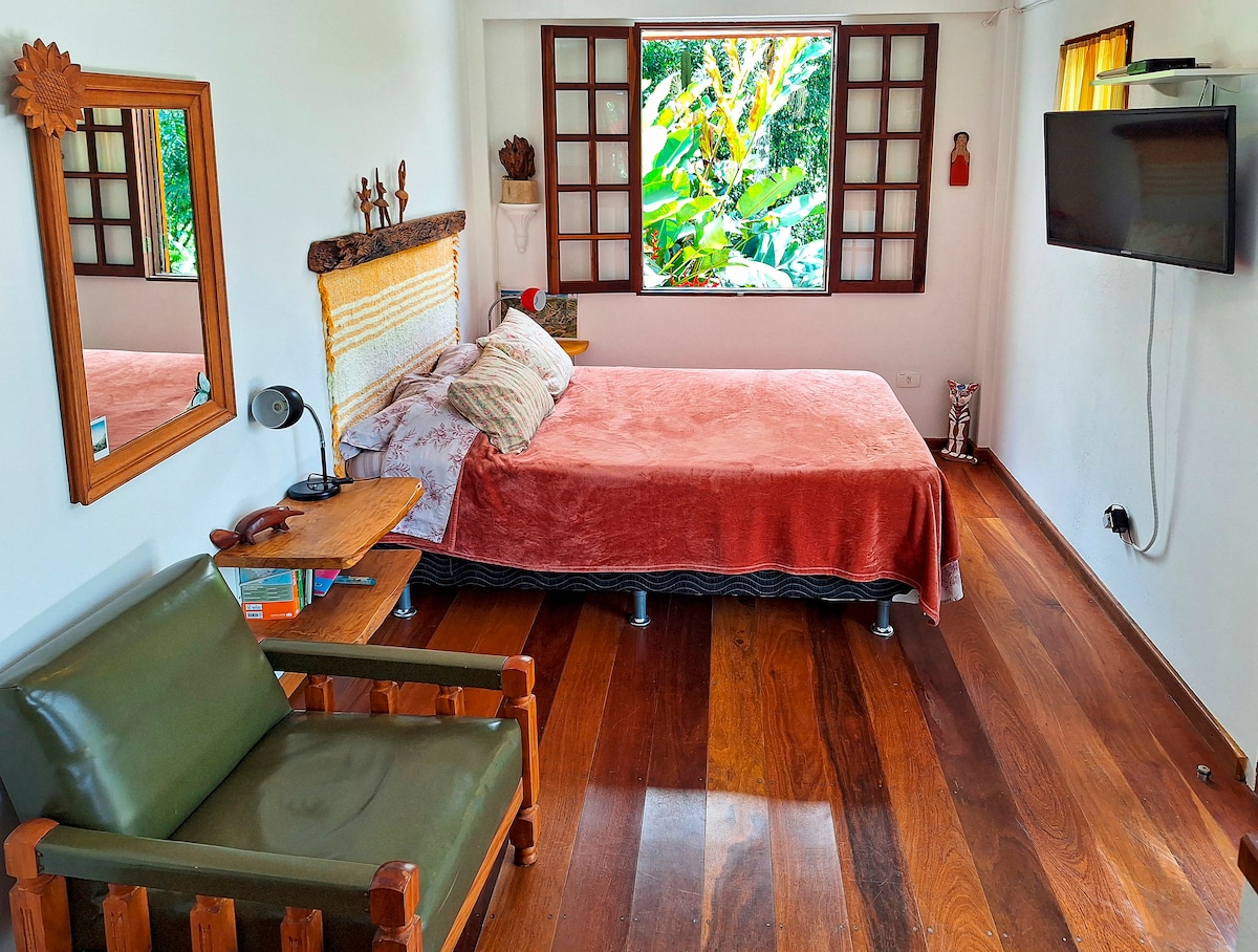 Роскошный люкс, полностью независимый и уединенный, с видом на чудесную мата Atlantica. Приезжайте и отдохните со звуком реки, просыпайтесь под пение птиц и свежий запах Флоресты Посуда и кофеварка доступны, чтобы гости могли приготовить свой собственный кофе в нашем люксе! Качество гостиницы с легкостью, доверием и опытом работы Airbnb! Легко добраться до центра Абраао, столицы Илья-Гранде Язык приема: испанский, португальский и A