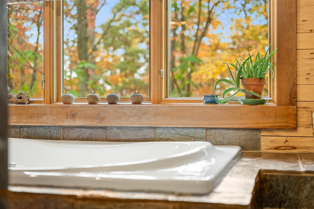 We look forward to welcoming you to the secluded beauty of our space, designed and built by my husband on our 20 acres of wooded property in the rolling hills of Central Ohio. A floor-to-ceiling glass front provides you with a view of fields green in summertime and ripe with goldenrod in the fall, four outdoor deck spaces invite you to relax in the beauty of nature, and a second story loft suite with a soaking tub are ready to provide you with rest and refreshment.