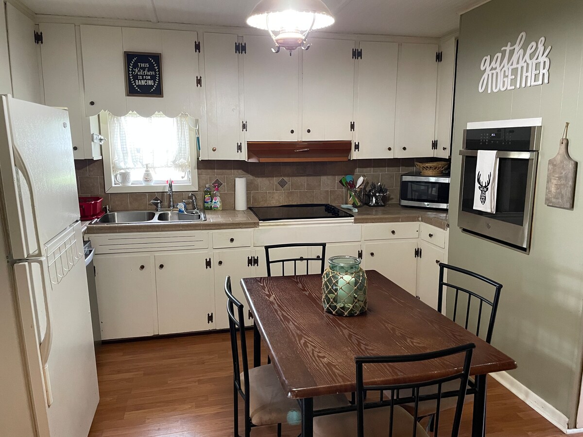 Наш дом является дуплексом, это 2 полных дома под одной крышей. Мы живем в одном конце, другой (аренда) имеет 2 спальни, 1 1/2 ванна/душ, гостиная/столовая, кухня, прачечная, шкафы. Простой и простой, но уютный и расслабляющий. Кухня со всеми аксессуарами. Постельное белье,банные полотенца, мыло и т.д. Переднее крыльцо: качели и планер/качалка с видом на запад. Павильон во дворе со столом для пикника, креслами-качалками, небольшим грилем и пожарным кольцом. Загородное место, где мирно, поют птицы.