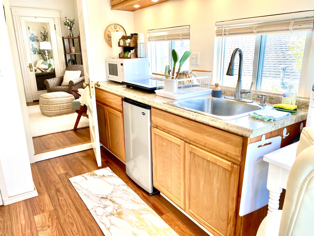 Вы не забудете время в этом романтичном, незабываемом месте. Кровать размера Queen size Гостевой дом с 1 спальней и 1 ванной комнатой Телевизор с подключенным Netflix премиум-класса. Полностью оборудованная кухня. Удобная гостиная. Доступна охраняемая парковка только для 1 автомобиля.