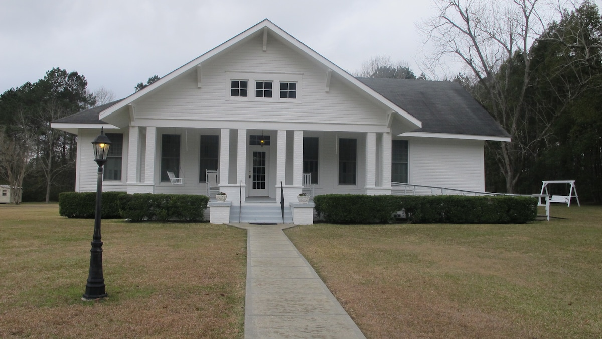 Built in 1904, Mimi's home offers a gracious southern comfort stay. 14’ ceilings and large windows create a bright and spacious home. From the elegant living room and spacious dining room to the huge open kitchen, Mimi's home is both intimate and welcoming. Three large bedrooms and sofa can easily accommodate 8 -10 or enjoyed luxuriously as an intimate getaway. On 25 acres, there is ample room to play in the yard, take a stroll into historic Wiggins, or rock the day away on the front porch.