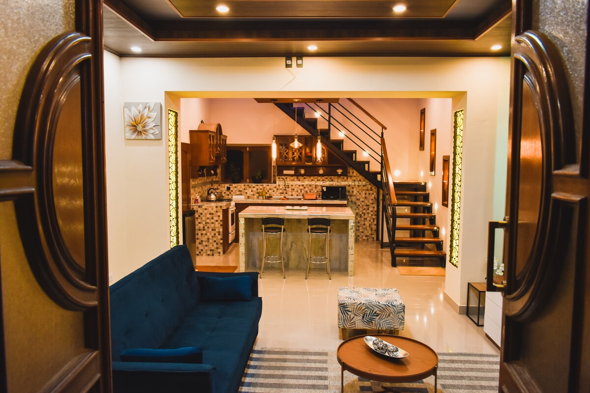A charming house, designed for couples, families, and small groups. Rest peacefully in its comfortable double bed and two full-size single beds, and enjoy the convenience of two bathrooms and a fully equipped kitchen to prepare your favorite meals. The living room, enhanced with LED strip lighting, creates a modern and relaxing atmosphere—perfect for conversations, movie nights, or enjoying a drink at the end of the day.