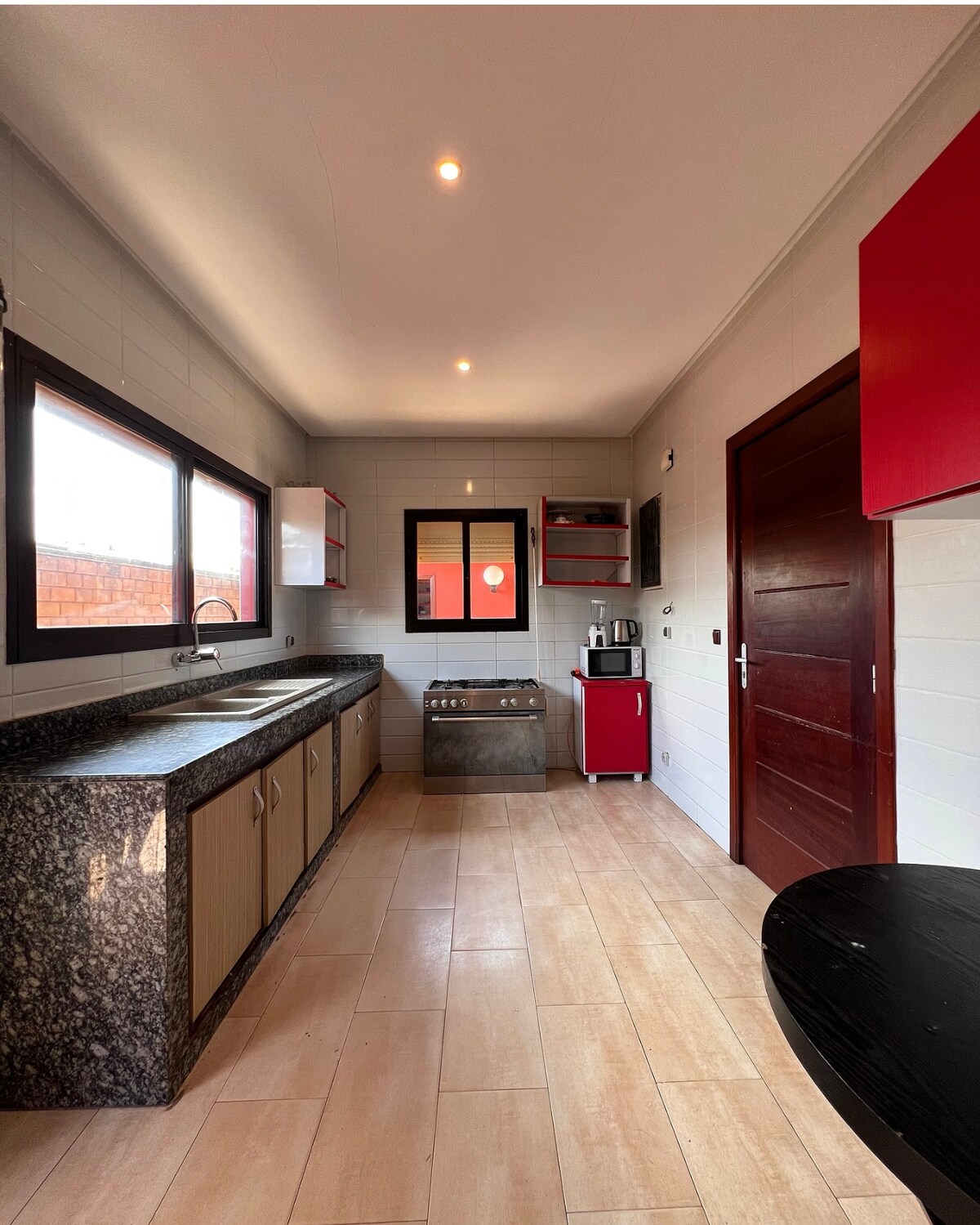 Резиденция безопасна. Она расположена в очень тихом городе вдали от городской суеты. Вилла тихая и элегантная Меблирована оборудованной кухней, гостиной с кондиционером, крытой террасой и закрытым двором. К услугам гостей 3 автономные спальни с кондиционером, ванной комнатой и туалетом. Спальня 1(основная спальня) двуспальная кровать размера King size +гардеробная 35 м2 Спальня 2 (2 односпальные кровати) Спальня 3 li Wi-Fi доступ Легко добраться по старой дороге 15 минут до аэропорта. 2 минуты до пляжа.