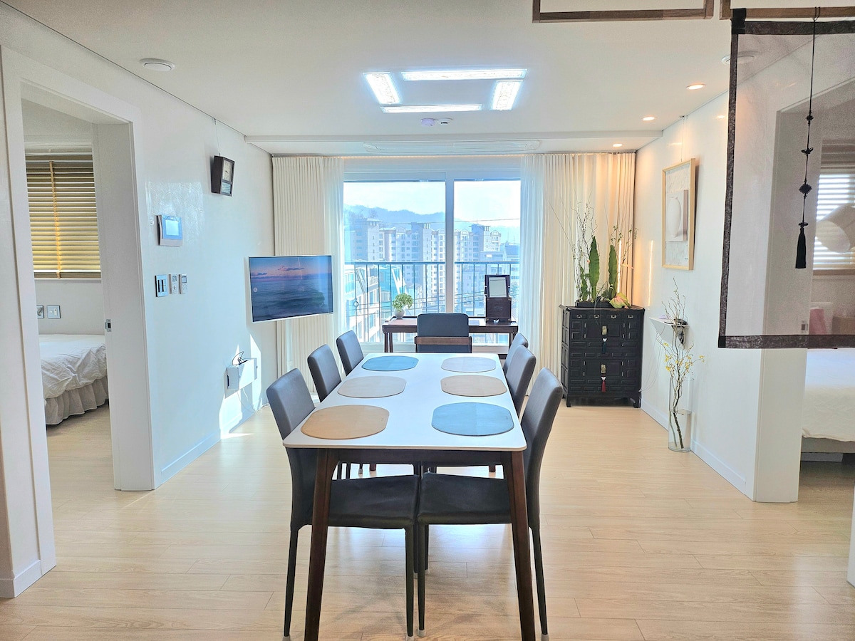 Fully renovated and cozy penthouse apartment with great views of Seoul. Don't miss the one from the hinoki bath. Portable WiFi provided. Great location in trendy Gangnam, one of the busiest districts of Seoul, blending modernity and tradition... Right out of Subway line n. 9 Bongeunsa station with Bongeunsa temple, Coex Mall and SM Town literally at your doorstep. 강남 도심과 한강, 그리고 녹음과 전통의 미가 어우러진 봉은사까지 파노라마 뷰를 즐길 수 있는 펜트하우스입니다. 고급 자재를 사용해 풀리노베이션하여 모던하고 쾌적합니다. 히노끼욕조에서 도심 노천탕 분위기 속에 피로를 풀어보세요.