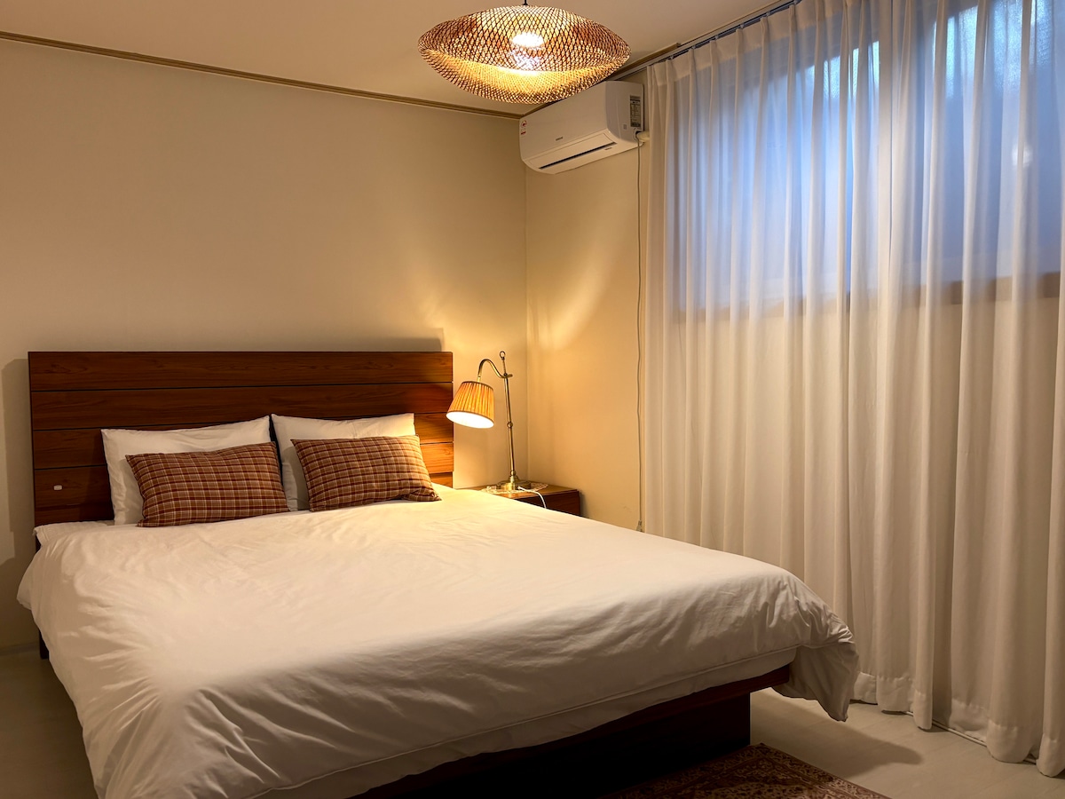 Здравствуйте, это J-STAY.🥰 ☆ Мы аккуратно украсили белую базовую основу белым постельным бельем и тканевыми реквизитами ручной работы, без беспорядка. В жилье могут разместиться до 5 человек. Подходит для длительного проживания без каких-либо недостатков. ★ Это полуподвал, который спускается по двум небольшим лестницам от ворот, но он недавно отремонтирован и имеет двор перед жильем, так что это чистое жилье с хорошим освещением и вентиляцией. ☆ Это тихий жилой район, рядом с домом есть 2 парка, где можно неторопливо прогуляться и отдохнуть.