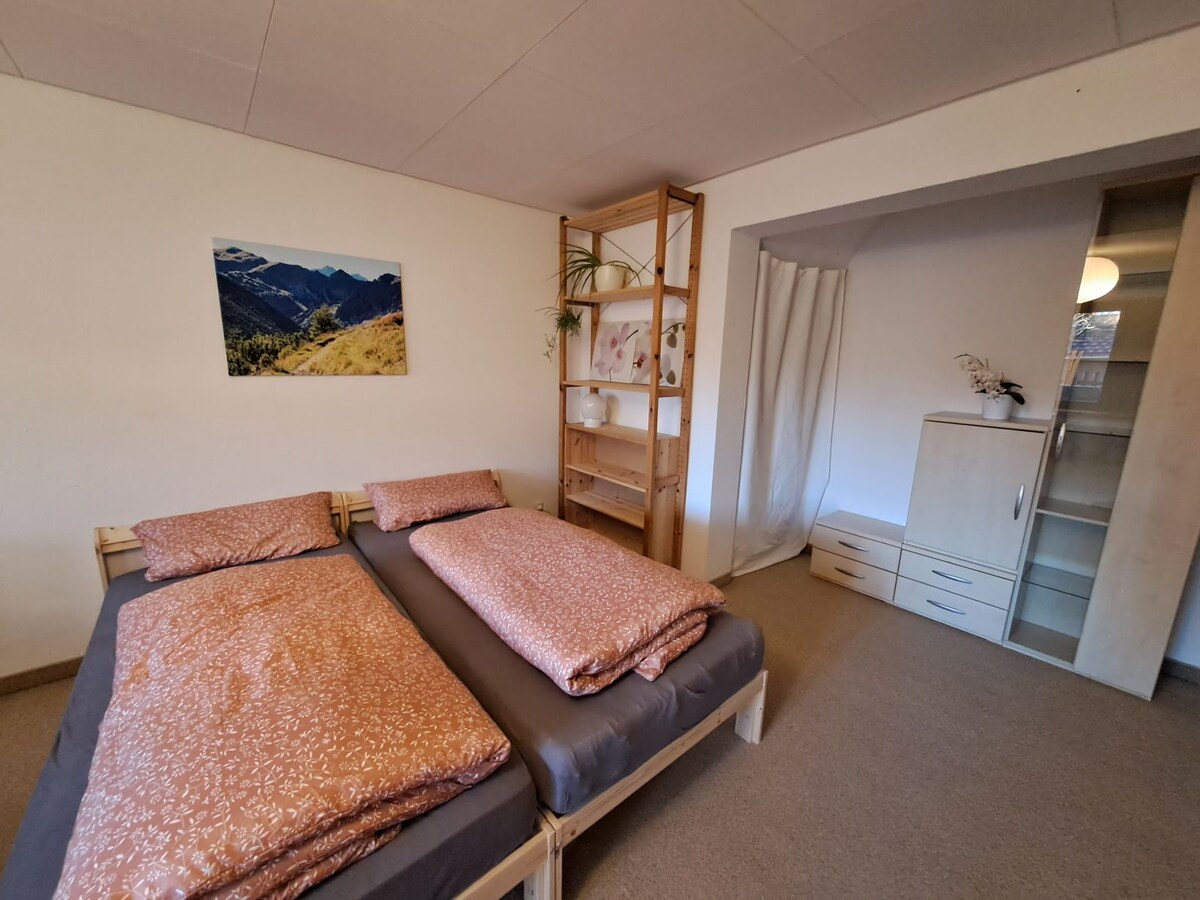 Уютная однокомнатная квартира для небольшого бюджета с отдельным входом, ванной комнатой, небольшой кухней. Идеально подходит в качестве отправной точки для экскурсий в Кемптен, Фюссен и т. д., для катания на лыжах, пеших прогулок или альпинизма. В квартире есть обеденная зона, диван, 2 кровати, Wi-Fi и телевизор. Есть парковка. Супермаркеты и пекарня находятся неподалеку. Квартира расположена на первом этаже дома с террасой в тихом жилом районе.