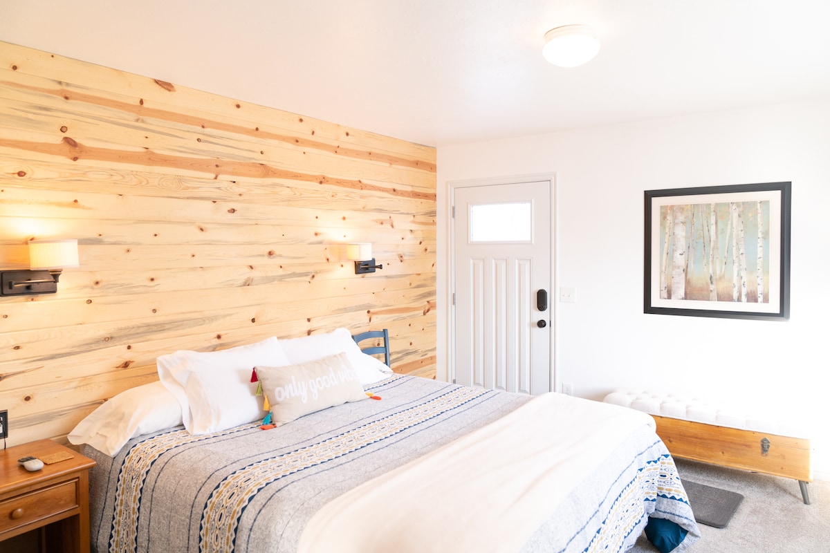 Расслабьтесь в этом уютном люксе с 1 спальней в удобном районе Сильвер-Крик-Виллидж в Парк-Сити. Рядом с RT40 (UT189), откуда легко добраться до Парк-Сити и Дир-Вэлли. Рядом пешие прогулки, прогулки на лыжах и горные велосипедные маршруты, включая Раунд-Вэлли. Район Splash Pad и детские площадки. Отдельный вход, двуспальная кровать размера Queen size, большой письменный стол с двумя стульями и USB-зарядными устройствами, ванной комнатой из плитки, мини-холодильником, большим шкафом и горячим чайником для кофе или чая. Бесплатный местный транспорт на High Valley Transit