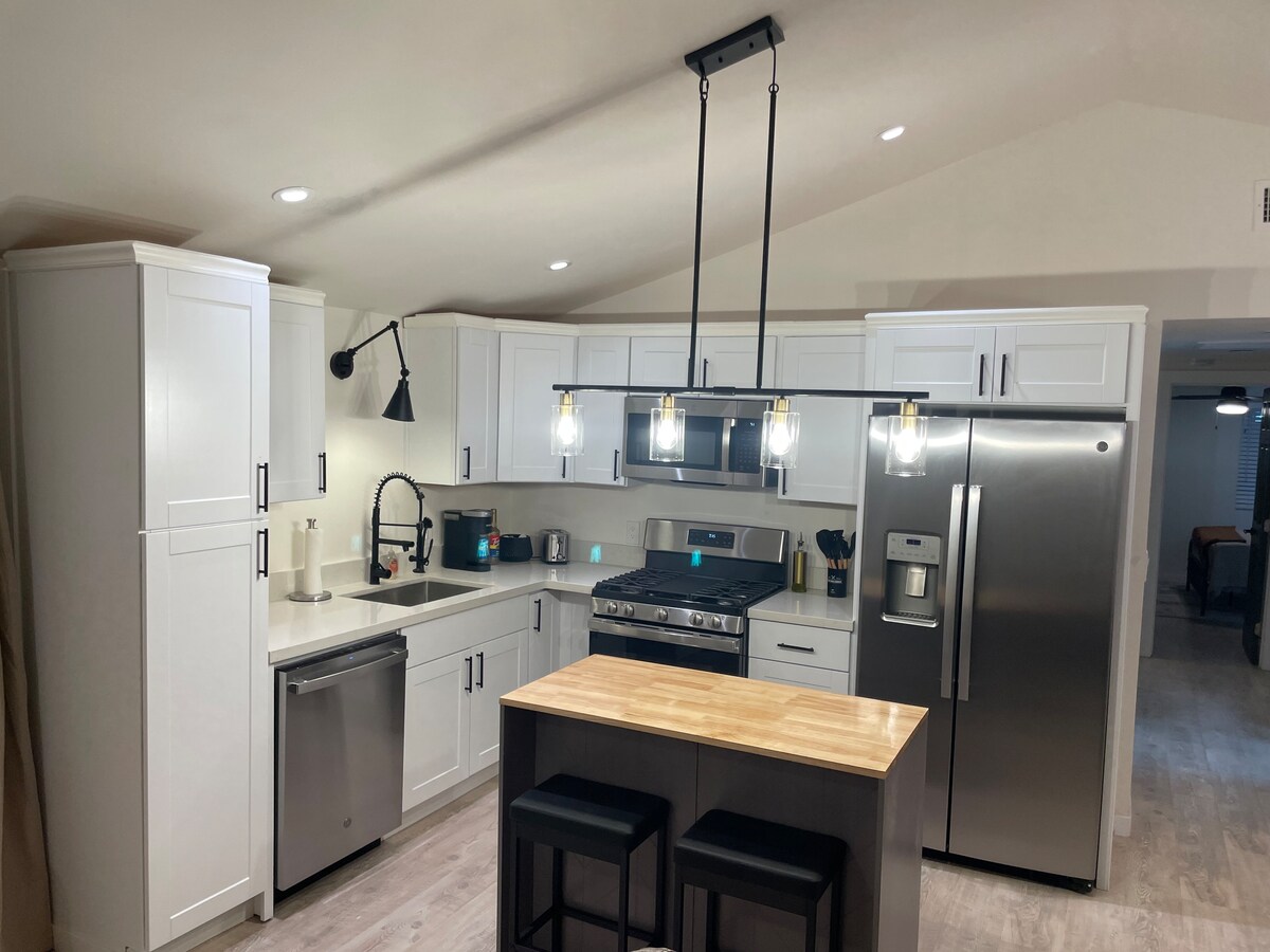 Недавно отремонтированная кухня полностью оборудована кварцевыми столешницами и новой техникой из нержавеющей стали. Кофемашина Kcup. В семейном номере есть смарт-телевизор для отдыха и наслаждения. Наш дом подходит для щенков, у нас полностью огороженный двор и хорошее патио. Рядом с достопримечательностями 2 минуты езды до стояния на углу, в центре города и Ла-Посада. — 3 мили до Клир-Крик. — 10 минут езды до Пейнтед-Дезерт. — 10 минут езды до руин Хомолови. — 60 минут в окаменелом лесу; - 45 минут до Флагстаффа. -60