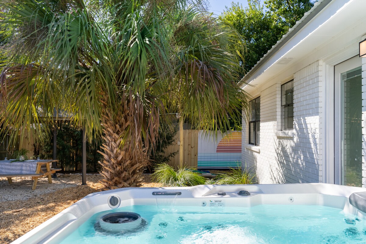 ☀ 5 минут пешком до пляжа. В ☀ пешей доступности рестораны, фастфуд, магазины ☀ Собаки приветствуются за проживание с домашними животными ☀ Расположено в центре города и тихий район В ☀ нескольких минутах от Пирс-парка и парка Фрэнка Брауна. ☀ Огороженный двор с джакузи, костровищем, зоной для пикника, корнхолом Идеально подходит для снежных птиц, семей, пар или небольших групп, которым нужно чем заняться после дня на пляже. Спальные места на 6 человек: Спальня 1: кинг-сайз + односпальная раскладная кровать (выдвижная) + ванная комната Спальня 2: Queen Гостиная: двухместный выдвижной стул.