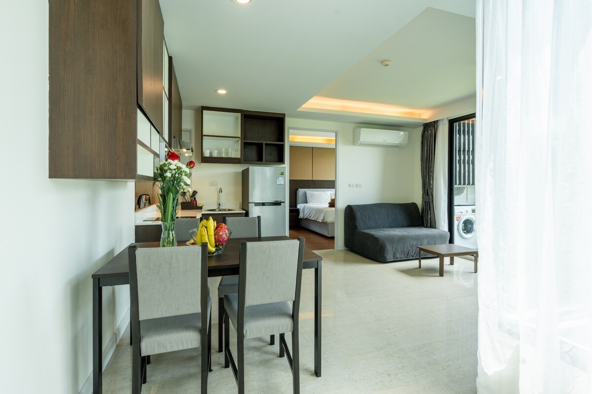 Люкс площадью 47 кв. м с одной спальней, балконом и частичным видом на море, в 650 м от пляжа Сурин. Кровать размера King size, гостиная с диваном; телевизоры Smart TV в обеих комнатах и два кондиционера для вашего комфорта. Готовьте на мини-кухне, стирайте белье в квартире и работайте или смотрите видео с Wi-Fi 500 Мбит/с. Наслаждайтесь великолепным панорамным бассейном на крыше с видом на океан, а также тренажерным залом и коворкингом. Самостоятельное заселение с помощью умного замка, коммунальные услуги включены — идеально подходит для пар, друзей или цифровых кочевников, которые ценят пространство и вид.