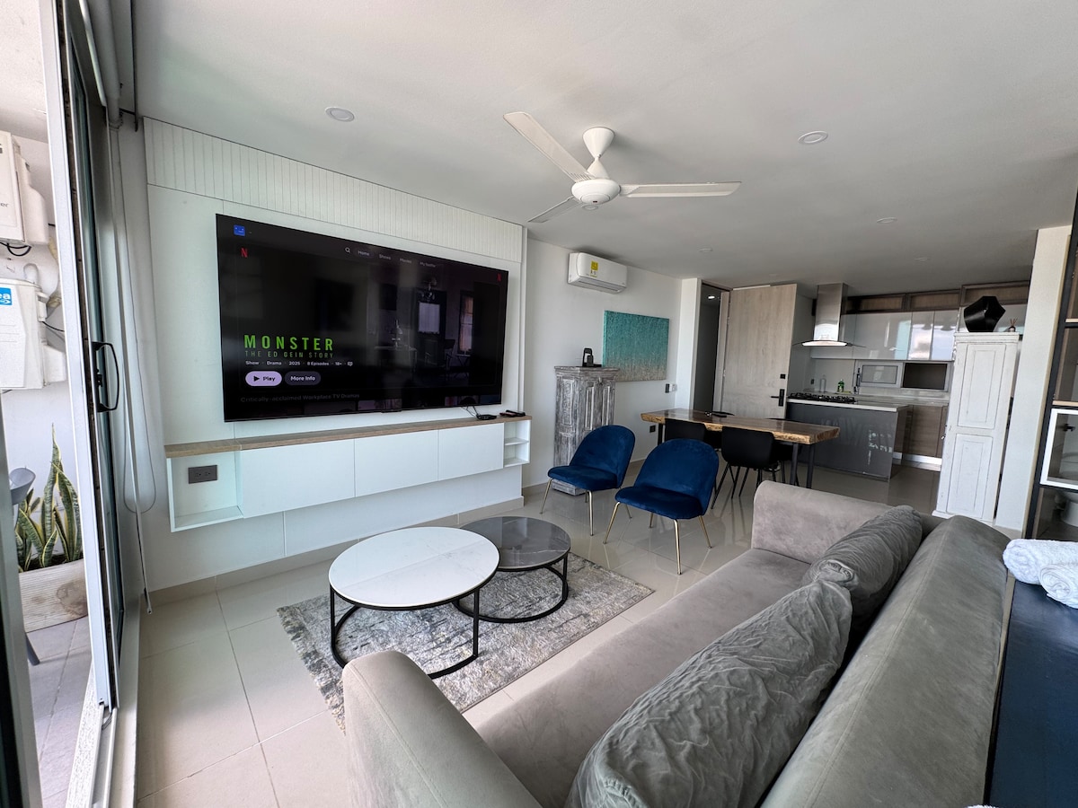 Красивая современная квартира на возвышенности на севере Барранкильи. Просторная квартира состоит из: - 1 просторный вход; - комната с телевизором на открытом воздухе; - диван-кровать; - островная кухня; - номер с собственной ванной комнатой и кондиционером; - Красивая просторная комната с кондиционером. - 1 фантастическая ванная комната с роскошным душем. - 1 общественная ванная комната, которая соединяется непосредственно с гостиной.