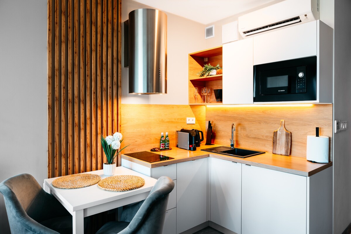 Новая комфортабельная студия Nova с кондиционером и гаражом для максимум 4 человек. Расположена на пятом этаже современного многоквартирного дома, архитектурно вдохновленного кирпичными зданиями нью-йоркского Бруклина, на перекрестке Богуславского бульвара XIX века и проспекта Нарутовича. Идеальное расположение — торговые центры, рестораны и клубы — все под рукой. Центральный железнодорожный вокзал в 10 минутах, международный аэропорт Щецина в 35 минутах, аэропорты Берлина в 2 часах.