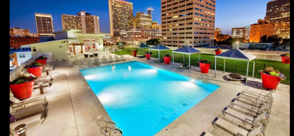 Насладитесь пребыванием в центре Атланты в этой безопасной квартире площадью 750 кв. футов с балконом! (вмещает 4 человек) Расположенная в гостиничном районе в центре Атланты, вы находитесь в нескольких шагах от концертных площадок, стадионов, мероприятий, ресторанов, ночных клубов; наслаждайтесь Атлантой, избегая хаоса в отеле. К вашим услугам круглосуточный консьерж-сервис и безопасный вход с брелоком; дружелюбная стойка регистрации сообщит вам о прибытии. Платная парковка есть на безопасной площадке за зданием. В квартире есть уютная спальня, диван-кровать, полностью оборудованная кухня, быстрый Wi-Fi и кофемашина Keurig!