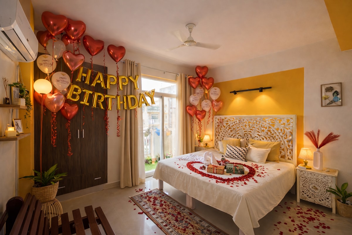 Создайте незабываемые воспоминания в этой светлой просторной квартире 3BHK с роскошными кроватями размера King size, элегантными интерьерами, отдельными балконами, примыкающими ванными комнатами и открытой кухней — всего в нескольких минутах от легендарного Тадж-Махала в Агре, исторических памятников, торговых мест и скоростной автомагистрали Ямуна. Живописный вид из дома с круглосуточной охраной, парковкой и другими удобствами. К услугам гостей все удобства, такие как кондиционеры, гейзер, Wi-Fi, вода RO, большое жилое пространство и хорошо оборудованная кухня.